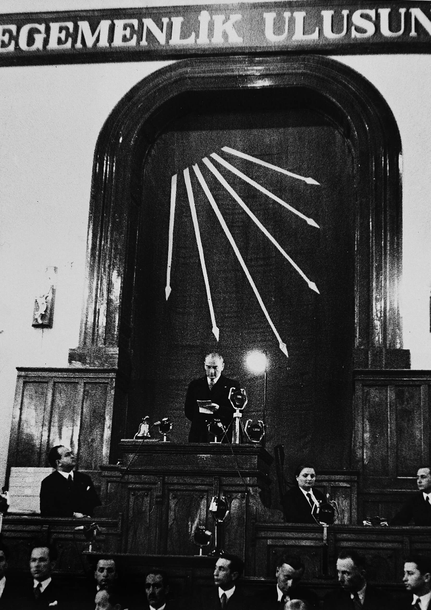 Arkadaşlar, geçmişte, en büyük felaketleri hazırlayan o geçmişte, çok uzak geçmişlerde bile Türk milletini benliğinden uzaklaştıran bir teşkilat vardı ki, ona devlet ve hükümet teşkilatı derlerdi. Millet, hükümet teşkilatının açıkça esiri idi. Halbuki Türk, esaret kabul etmeyen bir millettir. Türk milleti esir olmamıştır...